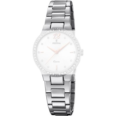 Esta bracelete de relógio Festina é feita de aço inoxidável e está fixada ao relógio através de pinos em aço. A bracelete tem uma largura de 16 mm e fecha através de fivela dobrável com botões de pressão. A bracelete não tem uma montagem a direito, o que significa que esta bracelete só é adequada para os relógios listados abaixo.
