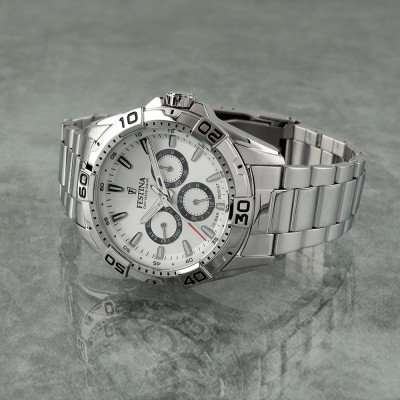 Este relógio Festina tem uma caixa de Inox com um diâmetro de 44 mm e está equipado com uma bracelete de metal. A caixa possui um movimento Miyota e o relógio tem um vidro Mineral.
