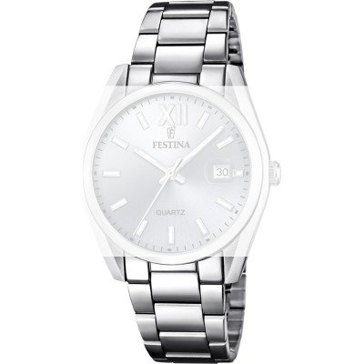 Esta bracelete de relógio Festina é feita de aço inoxidável e está fixada ao relógio através de pinos de pressão. A bracelete tem uma largura de 21 mm e fecha através de fivela dobrável com botões de pressão. A bracelete não tem uma montagem a direito, o que significa que esta bracelete só é adequada para os relógios listados abaixo.