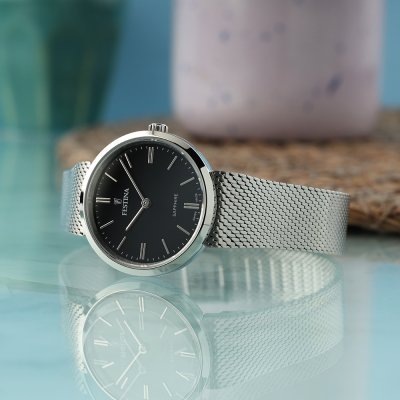 Este relógio Festina tem uma caixa de Inox com um diâmetro de 29 mm e está equipado com uma bracelete de Inox. A caixa possui um movimento Ronda e o relógio tem um vidro Safira.