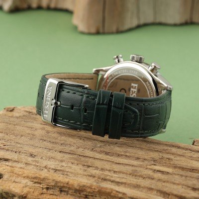 Este relógio Festina tem uma caixa de Inox com um diâmetro de 43 mm e está equipado com uma bracelete de couro. A caixa possui um movimento Miyota e o relógio tem um vidro Mineral.