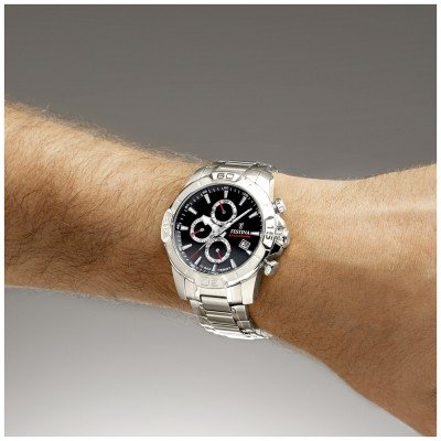 Este relógio Festina tem uma caixa de Inox com um diâmetro de 45 mm e está equipado com uma bracelete de Inox. A caixa possui um movimento Miyota e o relógio tem um vidro Mineral.