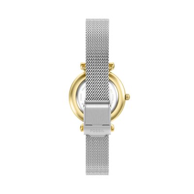 Este relógio Fossil tem uma caixa de Inox com um diâmetro de 28 mm e está equipado com uma bracelete de Inox. A caixa possui um movimento Seiko Instruments Inc. e o relógio tem um vidro Mineral.