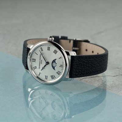 Este relógio Frederique Constant tem uma caixa de Inox com um diâmetro de 30 mm e está equipado com uma bracelete de couro. A caixa possui um movimento Frederique Constant e o relógio tem um vidro Safira.