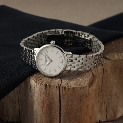 Este clássico relógio de mulher tem apenas 5,3 mm de espessura! Com uns elegantes 25 mm, este é um relógio ideal para todos os dias ou para mulheres que adoram uma elegância intemporal. O relógio é alimentado por um movimento de quartzo FC-202 com uma autonomia de 63 meses.