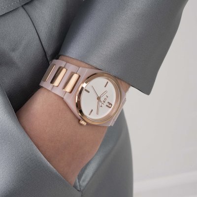 Este relógio Furla tem uma caixa de Aço inoxidável e plástico com um diâmetro de 34 mm e está equipado com uma bracelete de Aço inoxidável e plástico.