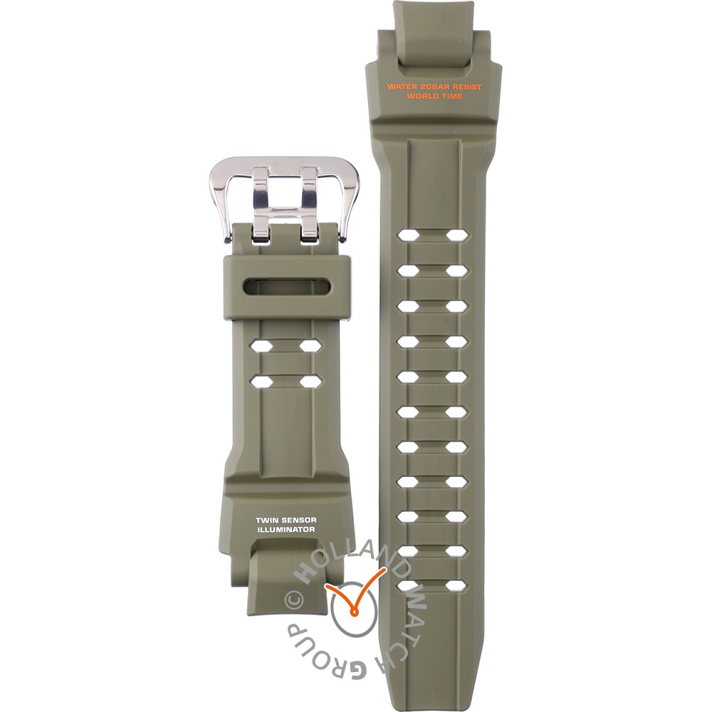 Esta bracelete de relógio G-Shock é feita de resina e está fixada ao relógio através de pinos de pressão. A bracelete tem uma largura de 26.5 mm e fecha através de fecho. A bracelete não tem uma montagem a direito, o que significa que esta bracelete só é adequada para os relógios listados abaixo.
