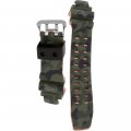 Esta bracelete de relógio G-Shock é feita de resina e está fixada ao relógio através de pinos de pressão. A bracelete tem uma largura de 22 mm e fecha através de fecho. A bracelete não tem uma montagem a direito, o que significa que esta bracelete só é adequada para os relógios listados abaixo.