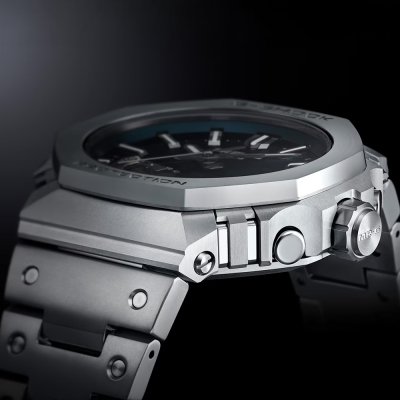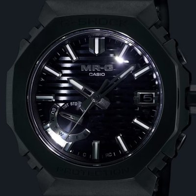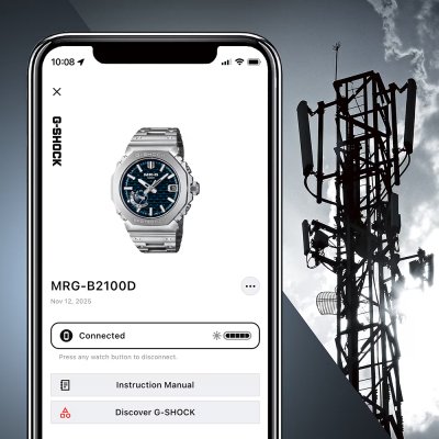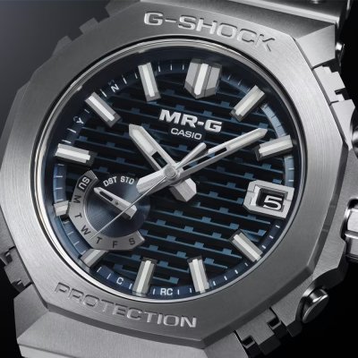 À primeira vista, o mostrador do MRG-B2100 pode parecer um simples mostrador texturado, mas, na verdade, tem uma textura 3D baseada num método japonês de trabalho em madeira chamado kigumi. Esta técnica envolve o encaixe de peças de madeira sem a utilização de fixações metálicas. Uma construção aparentemente simples com juntas engenhosas para criar algo verdadeiramente especial. O mesmo se aplica ao MRG-B2100; para além do mostrador belissimamente trabalhado, o relógio é um estudo de artesanato e de combinação de materiais inovadores. Montado na Linha de Produção Premium da Casio em Yamagata, a caixa e os (27 componentes individuais!) componentes da luneta são feitos de uma liga de titânio super-dura, Ti64. A parte superior da luneta é feita de COBARION, uma liga que é quatro vezes mais dura do que o titânio puro, e a bracelete é feita de outra liga especial de titânio, DAT55G, que é extremamente dura e altamente trabalhável. Com uma caixa de 44,4 × 49,5 × 13,6 mm, é um G-Shock de tamanho médio, mas perfeitamente usável, especialmente devido à leveza dos materiais, enquanto a construção multiguardas da caixa e da luneta garante uma resistência extra a choques. Todas as diferentes peças do relógio têm um revestimento de carbono tipo diamante (DLC) para uma resistência ainda maior aos riscos. O relógio é operado pelo módulo 5718 da Casio, que, para além do ajuste da hora controlado por rádio Multiband 6, oferece emparelhamento de smartphone via Bluetooth. Outras funções incluem um calendário automático até 2099, alerta de pilha fraca e um LED Super Illuminator. Outras funções da aplicação são a mudança automática para a hora de verão (DST), a correção automática e com um só toque da hora, o localizador de telefone, a correção do alinhamento dos ponteiros e o registo de hora e local.