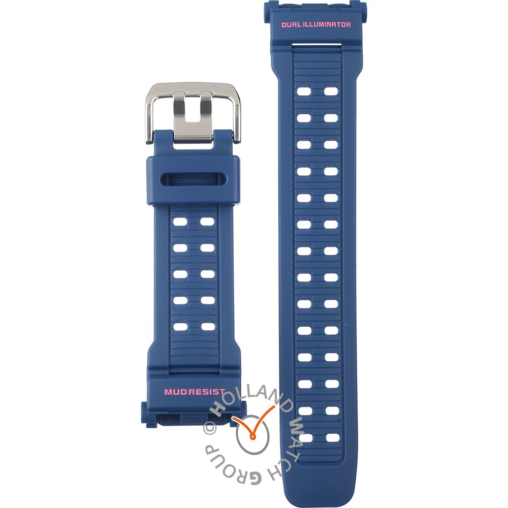 Esta bracelete de relógio G-Shock é feita de resina e está fixada ao relógio através de parafuso de sela. A bracelete tem uma largura de 27 mm e fecha através de fecho. A bracelete não tem uma montagem a direito, o que significa que esta bracelete só é adequada para os relógios listados abaixo.