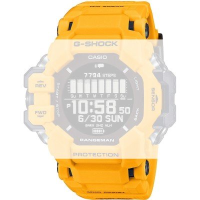 Esta bracelete de relógio G-Shock é feita de plástico de origem biológica e está fixada ao relógio através de parafuso de sela. A bracelete tem uma largura de 31 mm e fecha através de fecho. A bracelete não tem uma montagem a direito, o que significa que esta bracelete só é adequada para os relógios listados abaixo.