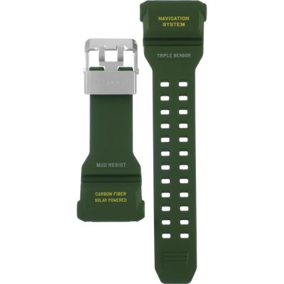 Esta bracelete de relógio G-Shock é feita de resina e está fixada ao relógio através de pinos de pressão. A bracelete tem uma largura de 28 mm e fecha através de fecho. A bracelete não tem uma montagem a direito, o que significa que esta bracelete só é adequada para os relógios listados abaixo.