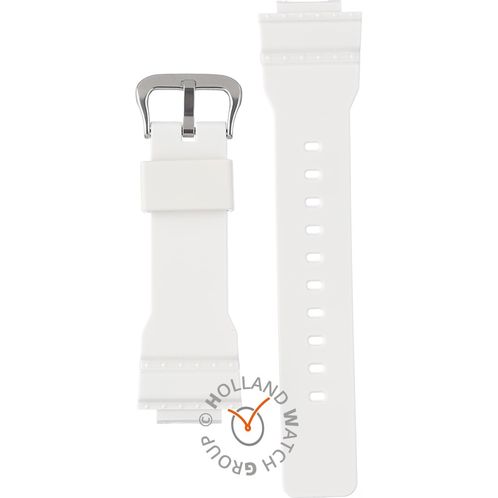 Esta bracelete de relógio G-Shock é feita de resina e está fixada ao relógio através de pinos de pressão. A bracelete tem uma largura de 25 mm e fecha através de fecho. A bracelete não tem uma montagem a direito, o que significa que esta bracelete só é adequada para os relógios listados abaixo.