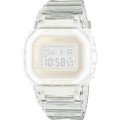 Esta bracelete de relógio G-Shock é feita de resina e está fixada ao relógio através de pinos de pressão. A bracelete tem uma largura de 22 mm e fecha através de fecho. A bracelete não tem uma montagem a direito, o que significa que esta bracelete só é adequada para os relógios listados abaixo.
