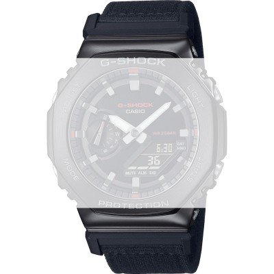 Esta bracelete de relógio G-Shock é feita de tecido e está fixada ao relógio através de pinos carregados por mola de liberação rápida. A bracelete tem uma largura de 21 mm e fecha através de fecho. A bracelete não tem uma montagem a direito, o que significa que esta bracelete só é adequada para os relógios listados abaixo.