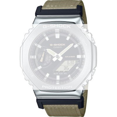 Esta bracelete de relógio G-Shock é feita de tecido e está fixada ao relógio através de pinos carregados por mola de liberação rápida. A bracelete tem uma largura de 21 mm e fecha através de fecho. A bracelete não tem uma montagem a direito, o que significa que esta bracelete só é adequada para os relógios listados abaixo.