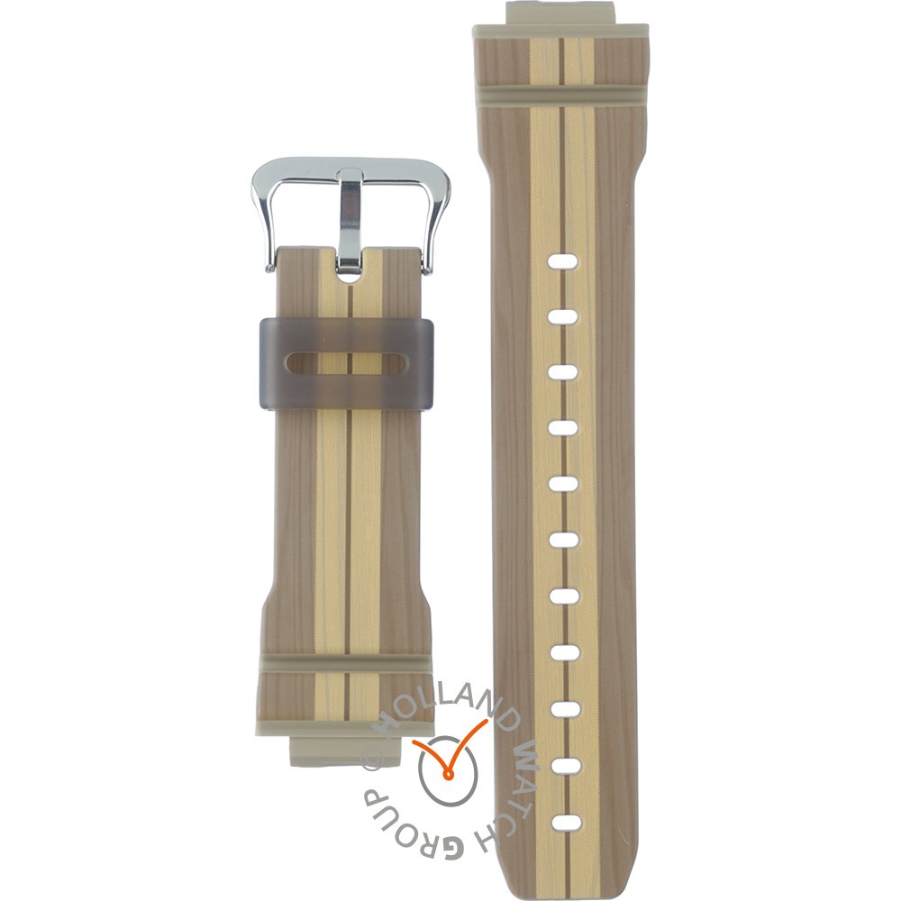 Esta bracelete de relógio G-Shock é feita de resina e está fixada ao relógio através de pinos de pressão. A bracelete tem uma largura de 25 mm e fecha através de fecho. A bracelete não tem uma montagem a direito, o que significa que esta bracelete só é adequada para os relógios listados abaixo.