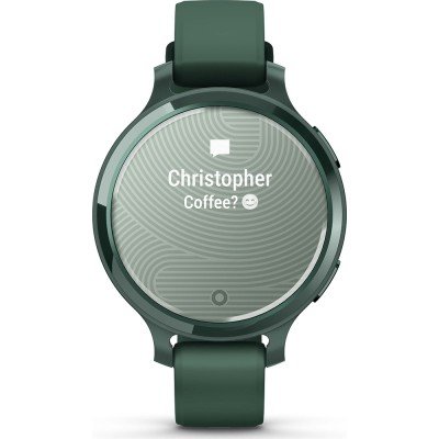 Este relógio Garmin tem uma caixa de Alumínio com um diâmetro de 38 mm e está equipado com uma bracelete de borracha. A caixa possui um movimento Garmin e o relógio tem um vidro Corning Gorilla Glass 3.