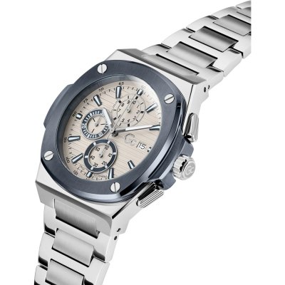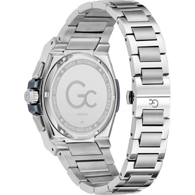 Este relógio GC tem uma caixa de Inox com um diâmetro de 44 mm e está equipado com uma bracelete de Inox. A caixa possui um movimento Ronda e o relógio tem um vidro Mineral revestido a safira.