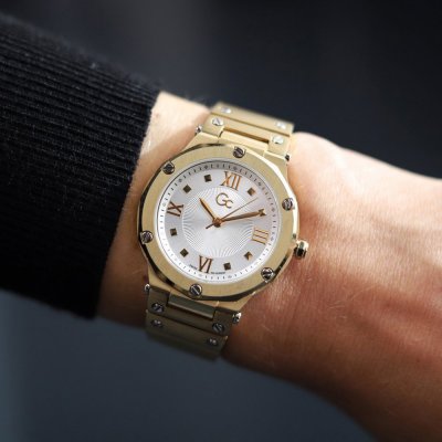 Este relógio GC tem uma caixa de Inox com um diâmetro de 36 mm e está equipado com uma bracelete de metal. A caixa possui um movimento Ronda e o relógio tem um vidro Mineral revestido a safira.