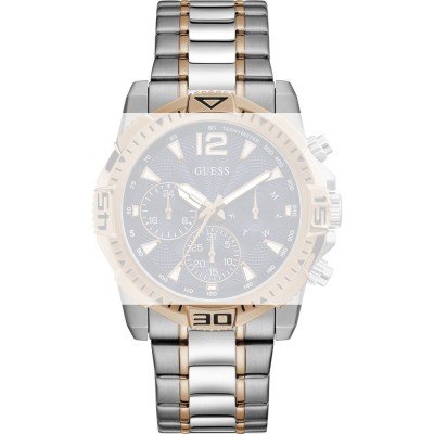 Esta bracelete de relógio Guess é feita de aço inoxidável e está fixada ao relógio através de pinos de pressão. A bracelete tem uma largura de 24 mm e fecha através de fivela dobrável com botões de pressão. A bracelete não tem uma montagem a direito, o que significa que esta bracelete só é adequada para os relógios listados abaixo.