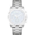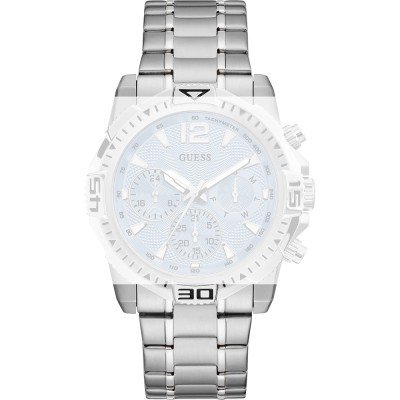 Esta bracelete de relógio Guess é feita de aço inoxidável e está fixada ao relógio através de pinos de pressão. A bracelete tem uma largura de 24 mm e fecha através de fivela dobrável com botões de pressão. A bracelete não tem uma montagem a direito, o que significa que esta bracelete só é adequada para os relógios listados abaixo.