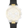 Esta bracelete de relógio Guess é feita de silicone e está fixada ao relógio através de pinos em aço. A bracelete tem uma largura de 24 mm e fecha através de fecho. A bracelete não tem uma montagem a direito, o que significa que esta bracelete só é adequada para os relógios listados abaixo.
