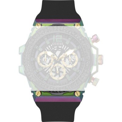 Esta bracelete de relógio Guess é feita de silicone e está fixada ao relógio através de pinos em aço. A bracelete tem uma largura de 33 mm e fecha através de fecho. A bracelete não tem uma montagem a direito, o que significa que esta bracelete só é adequada para os relógios listados abaixo.