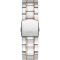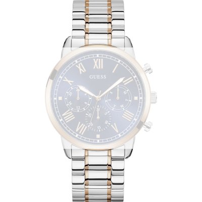 Esta bracelete de relógio Guess é feita de metal e está fixada ao relógio através de pinos de pressão. A bracelete tem uma largura de 22 mm e fecha através de fivela dobrável com botões de pressão. A bracelete não tem uma montagem a direito, o que significa que esta bracelete só é adequada para os relógios listados abaixo.