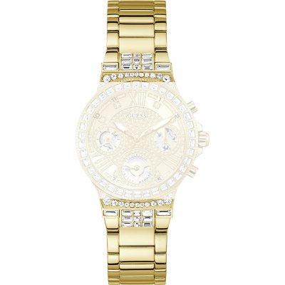 Esta bracelete de relógio Guess é feita de metal e está fixada ao relógio através de pinos de pressão. A bracelete tem uma largura de 20 mm e fecha através de fivela dobrável com botões de pressão. A bracelete não tem uma montagem a direito, o que significa que esta bracelete só é adequada para os relógios listados abaixo.
