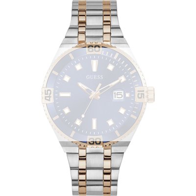 Esta bracelete de relógio Guess é feita de aço inoxidável e está fixada ao relógio através de pinos de pressão. A bracelete tem uma largura de 20 mm e fecha através de fivela dobrável com botões de pressão. A bracelete não tem uma montagem a direito, o que significa que esta bracelete só é adequada para os relógios listados abaixo.