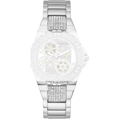 Esta bracelete de relógio Guess é feita de aço inoxidável e está fixada ao relógio através de pinos em aço. A bracelete tem uma largura de 24 mm e fecha através de fivela dobrável com botões de pressão. A bracelete não tem uma montagem a direito, o que significa que esta bracelete só é adequada para os relógios listados abaixo.