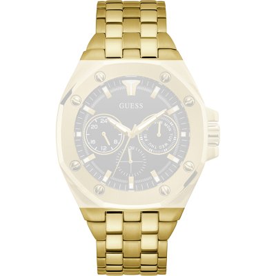 Esta bracelete de relógio Guess é feita de aço inoxidável e está fixada ao relógio através de pinos de pressão. A bracelete tem uma largura de 28 mm e fecha através de fivela dobrável com botões de pressão. A bracelete não tem uma montagem a direito, o que significa que esta bracelete só é adequada para os relógios listados abaixo.