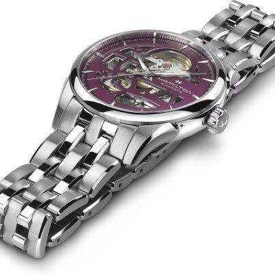 Para apreciar plenamente a beleza deste Jazzmaster Skeleton para mulher, basta fazer zoom no mostrador. Os seus recortes combinam com as peças do movimento por baixo, a sua cor combina com os rubis. Disponível com uma bracelete em aço inoxidável ou uma bracelete em pele com cores a condizer, este relógio de mulher não é apenas intrigante, mas também elegante e particularmente detalhado e com classe.