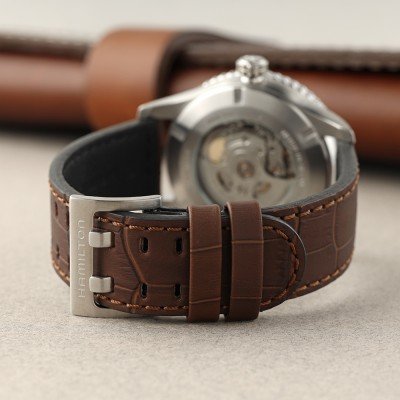 Este relógio Hamilton tem uma caixa de Inox com um diâmetro de 42 mm e está equipado com uma bracelete de couro. A caixa possui um movimento ETA e o relógio tem um vidro Safira anti-reflexo única.