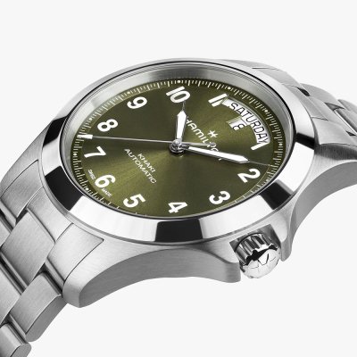 Este relógio Hamilton tem uma caixa de Inox com um diâmetro de 40 mm e está equipado com uma bracelete de Inox. A caixa possui um movimento ETA e o relógio tem um vidro Safira anti-reflexo única.