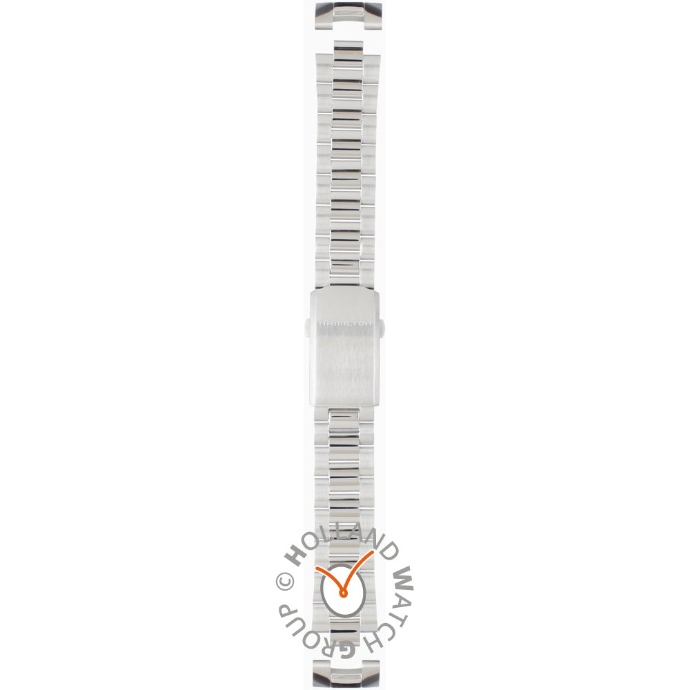Esta bracelete de relógio Hamilton é feita de aço inoxidável e está fixada ao relógio através de pinos de pressão. A bracelete tem uma largura de 20 mm e fecha através de fivela dobrável com botões de pressão. A bracelete não tem uma montagem a direito, o que significa que esta bracelete só é adequada para os relógios listados abaixo.