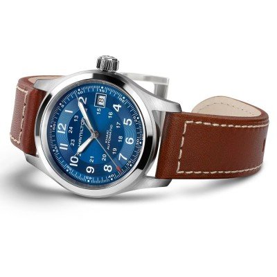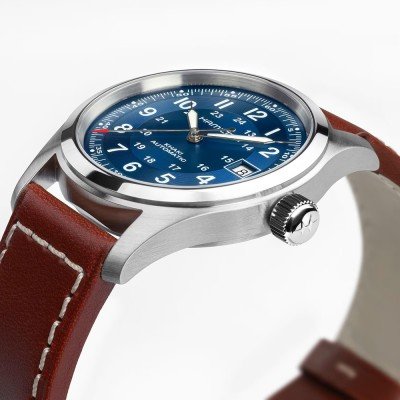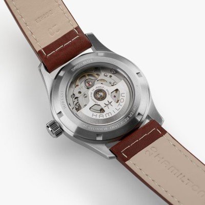Este relógio Hamilton tem uma caixa de Inox com um diâmetro de 38 mm e está equipado com uma bracelete de couro. A caixa possui um movimento ETA e o relógio tem um vidro Safira.