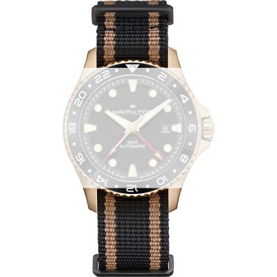 Esta bracelete de relógio Hamilton é feita de tecido e está fixada ao relógio através de pinos de pressão. A bracelete tem uma largura de 22 mm e fecha através de fecho. A bracelete tem uma montagem a direito, o que significa que esta bracelete é adequada para todos os relógios Hamilton com montagem da bracelete a direito.