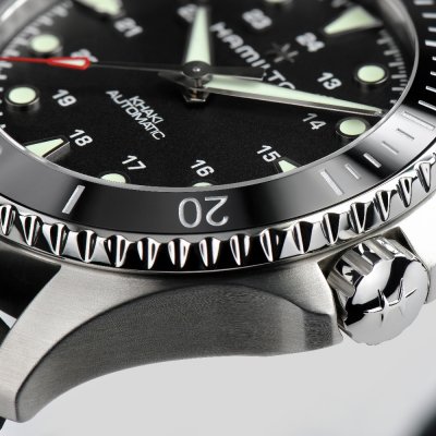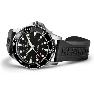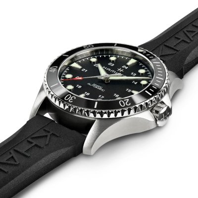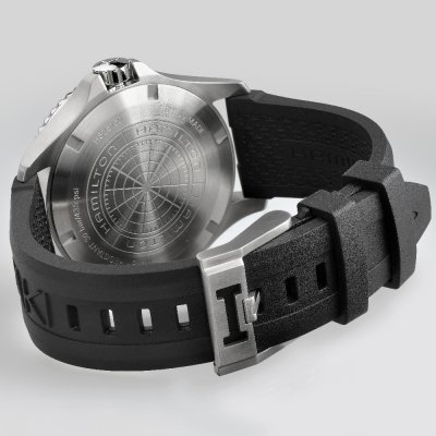 Este relógio Hamilton tem uma caixa de Inox com um diâmetro de 43 mm e está equipado com uma bracelete de borracha. A caixa possui um movimento ETA e o relógio tem um vidro Safira anti-reflexo única.