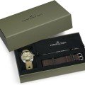 Este relógio Hamilton tem uma caixa de Inox com um diâmetro de 42 mm e está equipado com uma bracelete de couro. A caixa possui um movimento ETA e o relógio tem um vidro Safira.