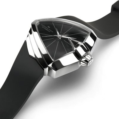 O Hamilton Ventura foi o primeiro relógio elétrico do mundo alimentado por bateria. Hoje, este novo Ventura S já não é elétrico, mas sim mecânico automático! O movimento automático suíço ETA C26.101 com mola de balanço Nivachron oferece 48 horas de reserva de marcha. O aspeto do relógio continua a ser vanguardista, com degraus bem definidos na caixa e uma coroa em forma de turbina. O relógio de 38 mm está disponível em preto e cinzento rosado, conferindo claramente ao Ventura S um carácter unissexo, oferecendo muita originalidade e vibrações rock 'n roll únicas!