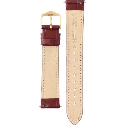 Esta bracelete de relógio Hirsch é feita de couro e está fixada ao relógio através de pinos carregados por mola de liberação rápida. A bracelete tem uma largura de 18 mm e fecha através de fecho. A bracelete tem uma montagem a direito, o que significa que esta bracelete é adequada para todos os relógios com montagem da bracelete a direito.