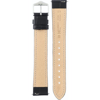 Esta bracelete de relógio Hirsch é feita de couro e está fixada ao relógio através de pinos carregados por mola de liberação rápida. A bracelete tem uma largura de 18 mm e fecha através de fecho. A bracelete tem uma montagem a direito, o que significa que esta bracelete é adequada para todos os relógios com montagem da bracelete a direito.