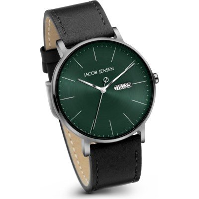 Este relógio Jacob Jensen tem uma caixa de Titânio com um diâmetro de 40 mm e está equipado com uma bracelete de couro. A caixa possui um movimento Miyota e o relógio tem um vidro Safira.