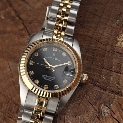 Este relógio Jacques du Manoir tem uma caixa de Inox com um diâmetro de 26 mm e está equipado com uma bracelete de Inox. A caixa possui um movimento Ronda e o relógio tem um vidro Mineral.