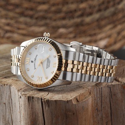 Este relógio Jacques du Manoir tem uma caixa de Inox com um diâmetro de 34 mm e está equipado com uma bracelete de Inox. A caixa possui um movimento Ronda e o relógio tem um vidro Mineral.