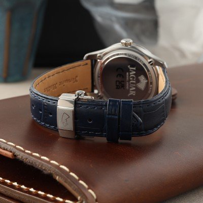 Este relógio Jaguar tem uma caixa de Inox com um diâmetro de 40 mm e está equipado com uma bracelete de couro. A caixa possui um movimento Ronda e o relógio tem um vidro Safira.