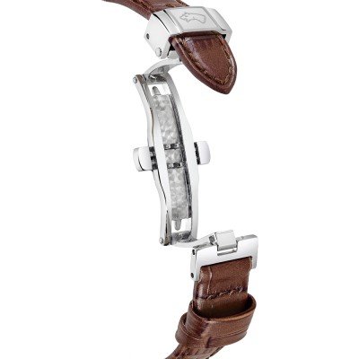 Este relógio Jaguar tem uma caixa de Inox com um diâmetro de 29 mm e está equipado com uma bracelete de couro. A caixa possui um movimento Ronda e o relógio tem um vidro Safira.