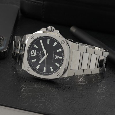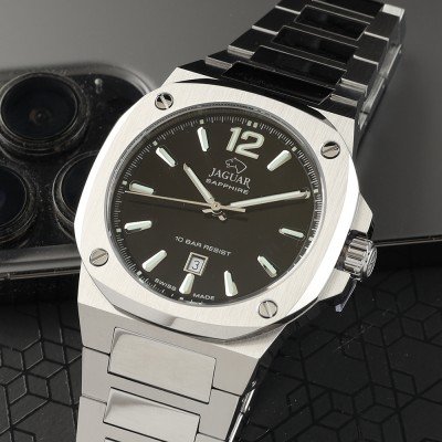 Este relógio Jaguar tem uma caixa de Inox com um diâmetro de 41 mm e está equipado com uma bracelete de Inox. A caixa possui um movimento Ronda e o relógio tem um vidro Safira.
